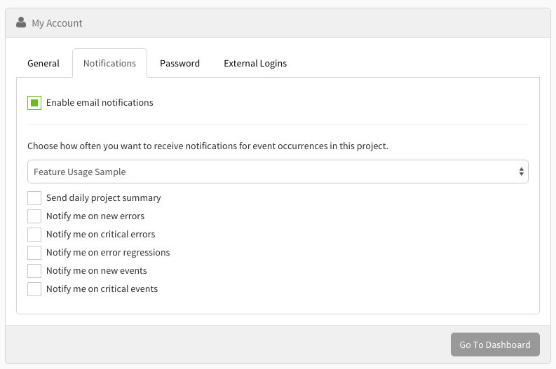To turn on email notifications, go to "My Account" in your dashboard, then click on the "Notifications" tab.