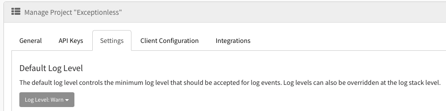 You can customize the log levels Exceptionless will track for you. ON. THE. FLY. You don't have to touch your code. Instead, should you run into the problem above, you can change your default log level and it will be applied immediately. Any new events coming through that match the level you set will now be stacked up and tracked for you.